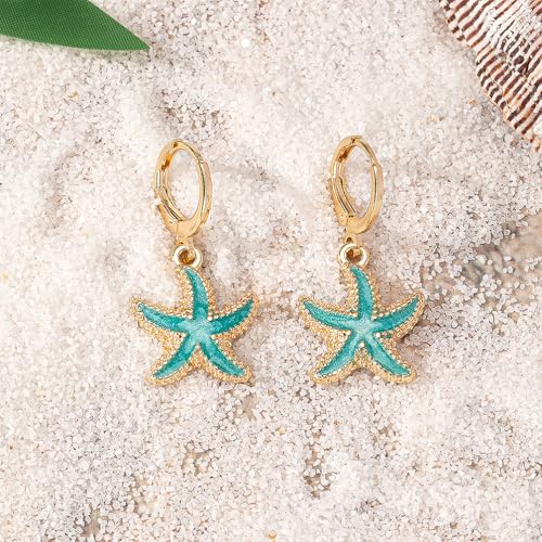 Boho Starfish Sea Star Shell Enamel Dangle Hoop Earrings for Women, Trendy Gold Plated Dripping Oil Drop Huggie Earrings Hawaii Vocation Beach Party Ear Jewelry Gift 6