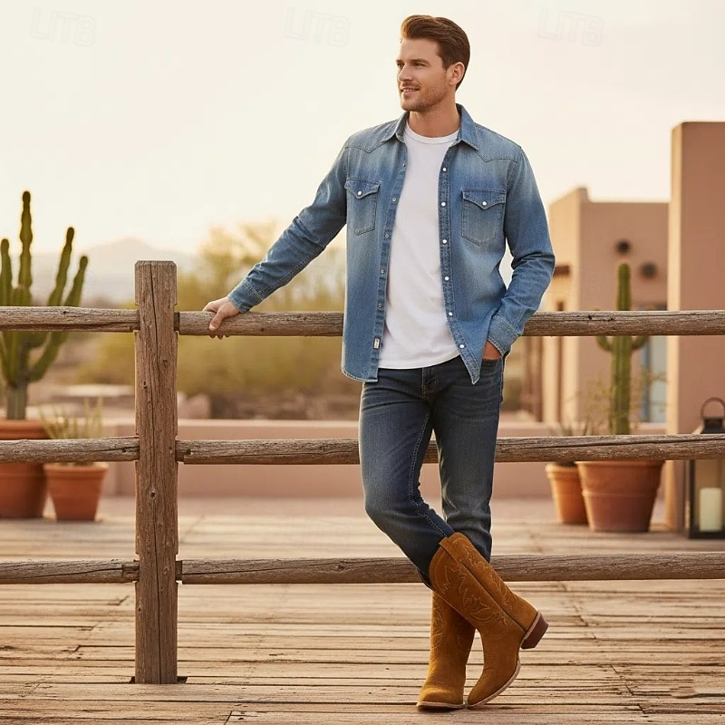 Men's Classic Suede Western Cowboy Boots - Brown Faux Leather Mid-Calf Embroidered Rodeo Style - Perfect for Rodeo, Country Weddings, and Outdoor Events 1