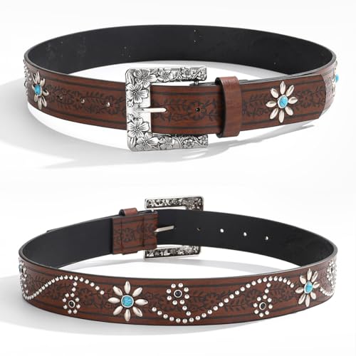 HOT ! Western-Cowgirl-Rivet-Belt for Women - Versatile Studded Bling Floral-Cowboy-Belt Waist with turquoise for Jeans Pants