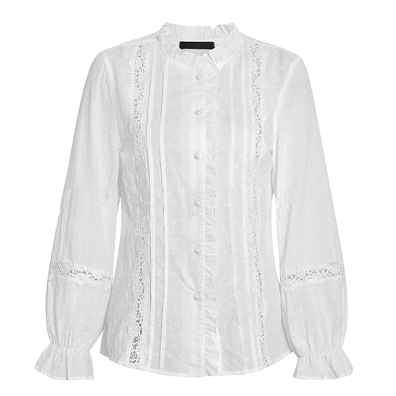 Highlights [Fabric] Crafted from a lightweight polyester fabric, this blouse offers a breathable and comfortable wear for both spring and fall seasons. The material is slightly elastic, ensuring a fit that moves with you while maintaining its elegant shape. [Fit] The blouse features a regular fit, enhancing the wearer's silhouette without being overly tight. The standing collar design offers a sophisticated touch, which complements the long sleeves, finished with elastic cuffs for added comfort and style. [Design Highlights] This vintage-styled blouse is adorned with exquisite lace patchwork details, lending a touch of femininity and elegance. The classic button-down front is accentuated by ruffled detailing along the placket, creating a timeless and fashionable look that stands out. The top also includes eyelet design elements, adding subtle texture and interest. [Occasions] Ideal for a variety of settings, this blouse transitions seamlessly from daily wear to weekend outings and casual gatherings. Its vintage charm and versatile style pair perfectly with both jeans and skirts, making it suitable for both casual and semi-formal events. [Size Range] Available in sizes S, M, L, XL, and 2XL, ensuring a suitable fit for a range of body types. The blouse is designed to accommodate different preferences and offers flexibility in styling, whether tucked in or worn loose.