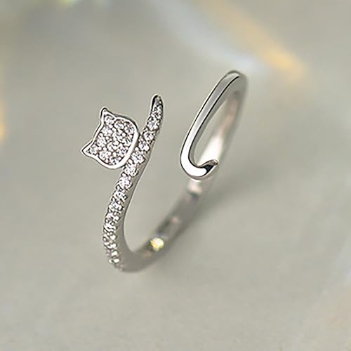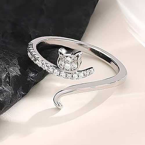 HOT ! 925 Sterling Silver Cute Cat Adjustable Rings Kitten Animal Stackable Rings to Daughter 14K Gold Plated Dainty Lovely CZ Cats Animals Ring for Cat Lovers Women Engagement Birthday Jewelry Gift