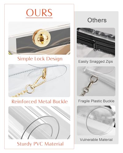 • Locked in Style: Snap shut in sophistication with our clear crossbody purse, featuring a sleek circular lock that's as functional as it is stylish. This chic lock seals the bag securely and prevents accidental opening. The stadium approved clear bags allow you to easily see the contents inside, making it convenient for quick access and organization.