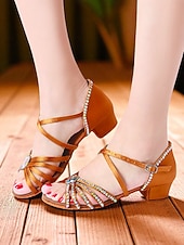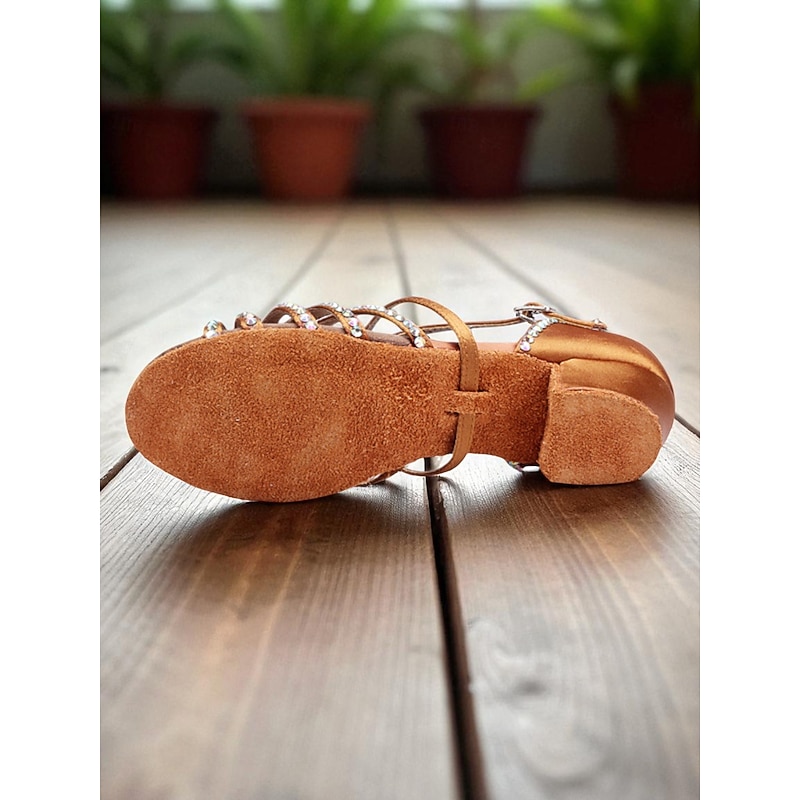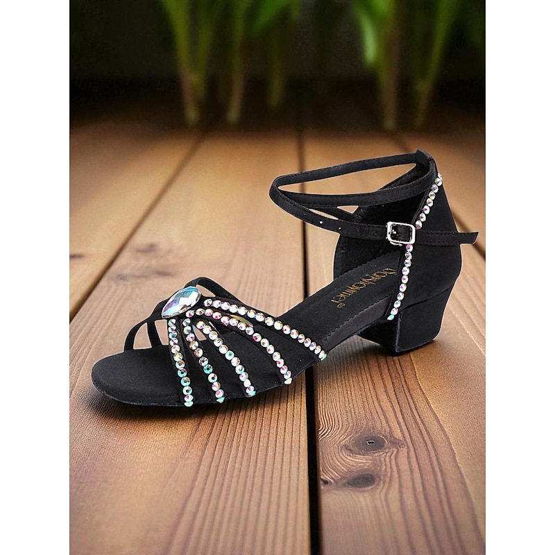 More information about Women's Girls Youth Rhinestone Strappy Latin Dance Shoes with Low Block Heel - Professional Ballroom Practice and Performance Sandals