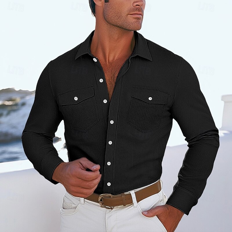 More information about Men's Shirt Button Up Shirt Casual Shirt Corduroy Shirt Black Navy Blue Beige Long Sleeve Solid Color Lapel Daily Vacation Pocket Clothing Apparel Fashion Casual Comfortable