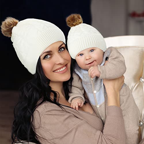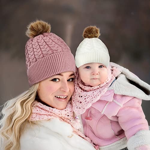 • Package quantity: the package comes with 2 pieces of mom's winter cable knit beanies and 2 pieces of matching baby knit beanies with fluff faux fur balls, available in pink and white, enough quantity and classic styles to wear and change throughout the winter
