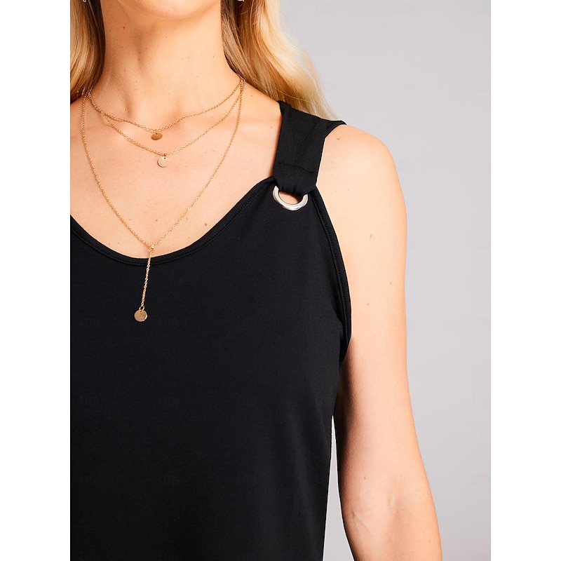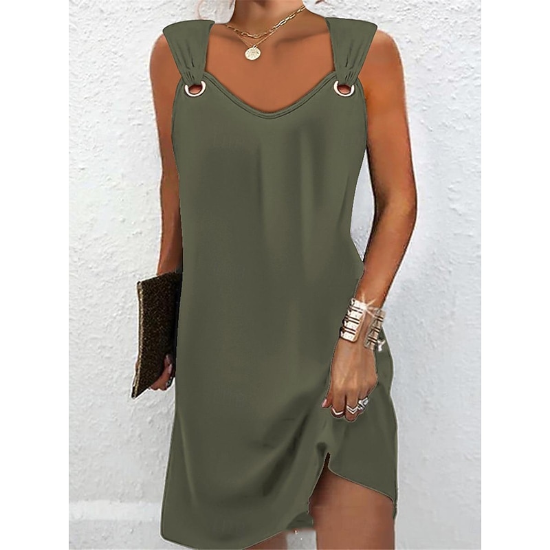 Highlights [Fabric] : Crafted from high-quality polyester, this dress boasts a smooth and lightweight texture, ensuring comfort and a flattering drape. The micro-elastic nature of the fabric allows for ease of movement, making it an ideal choice for spring and summer wear. [Silhouette] : Featuring a chic A-line silhouette, this mini dress offers a loose fit that flatters a variety of body types. [Design Highlights] : The dress is designed with a stylish V-neckline accompanied by striking metallic ring details on the straps, adding a modern flair. The ruched design enhances its sophisticated appeal, while the sleeveless cut ensures a breezy, comfortable experience. [Occasions] : Perfect for a range of occasions, this versatile dress is suitable for daily outings, weekend getaways, and date nights. Pair it effortlessly with accessories and a clutch for a more elevated look. [Size Range] : Available in sizes S, M, L, XL, and XXL, this dress caters to a wide audience, ensuring a perfect fit for everyone.