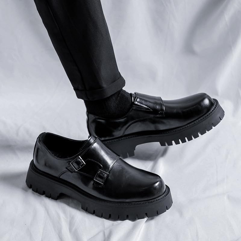 HOT ! Men's Leather Black Business Platform Work Shoes Slip-on Double Monk Strap Dress Oxford Sneakers Fashion Non-Slip Low Top Walking Shoes