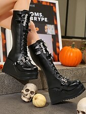 $64.99 - Women's Black Gothic Platform Lace-Up Boots – Punk Skull Buckle Tall Wedge Boots for Halloween Cosplay, Concerts and Alternative Streetwear 2025. Shop for cheap Shoes For Women online? Buy at lightinthebox.com on sale today!