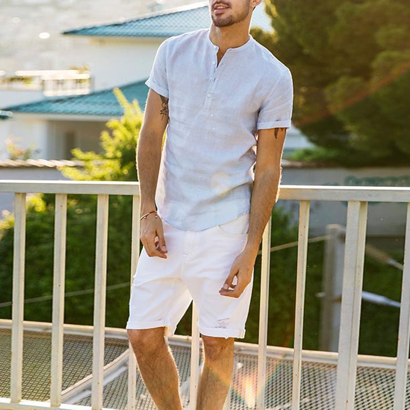 More information about Men's Shirt Linen Shirt Summer Shirt Beach Wear Band Collar Shirt Solid Color Vacation Street Light Blue Black White Pink Short Sleeve Collar Clothing Apparel