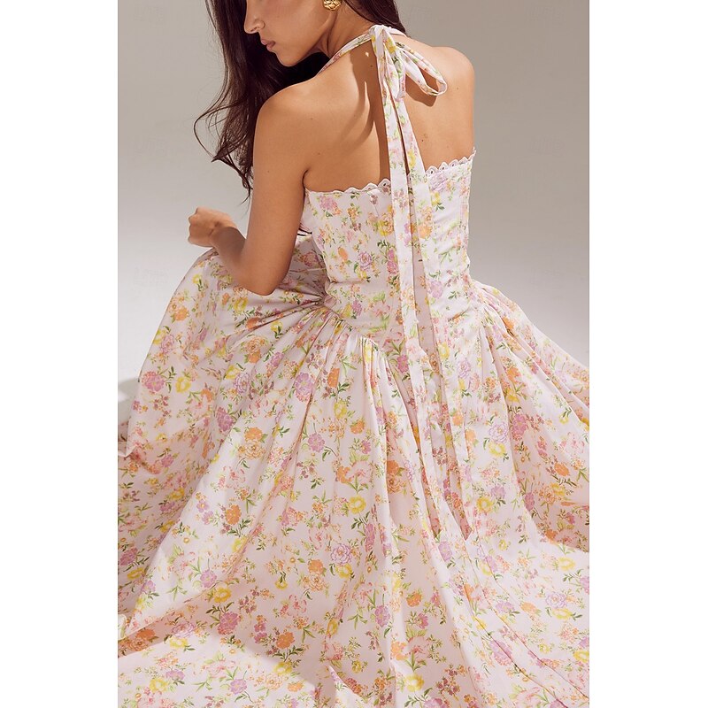 Retro Vintage Medieval Renaissance Midi Dress Flare Dress Halter Regency Inspired Floral Fancy Dress Women's Masquerade Wedding Vacation Casual Daily Adults' Dress Summer 24
