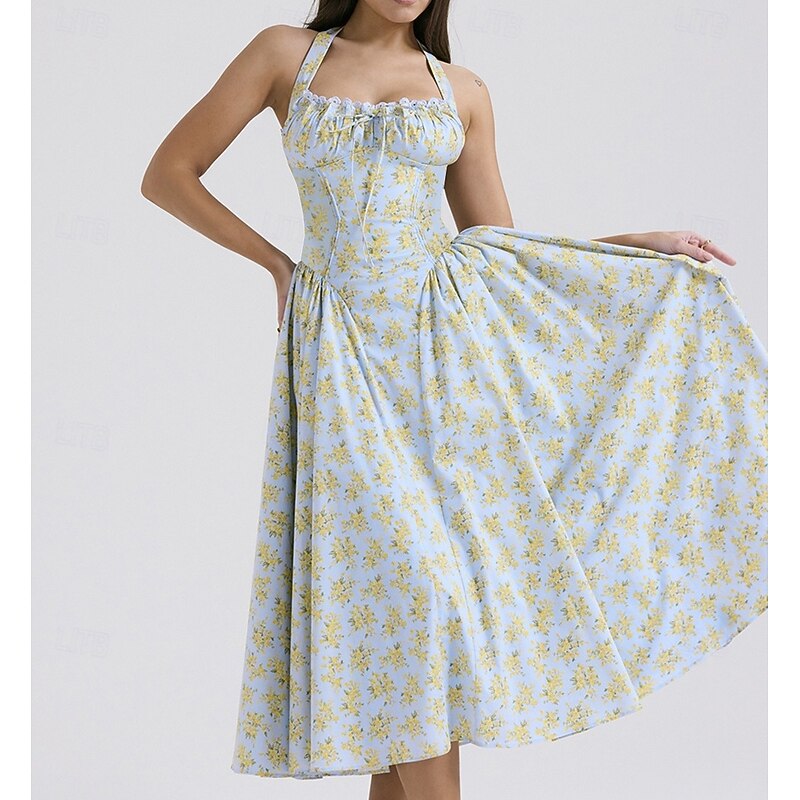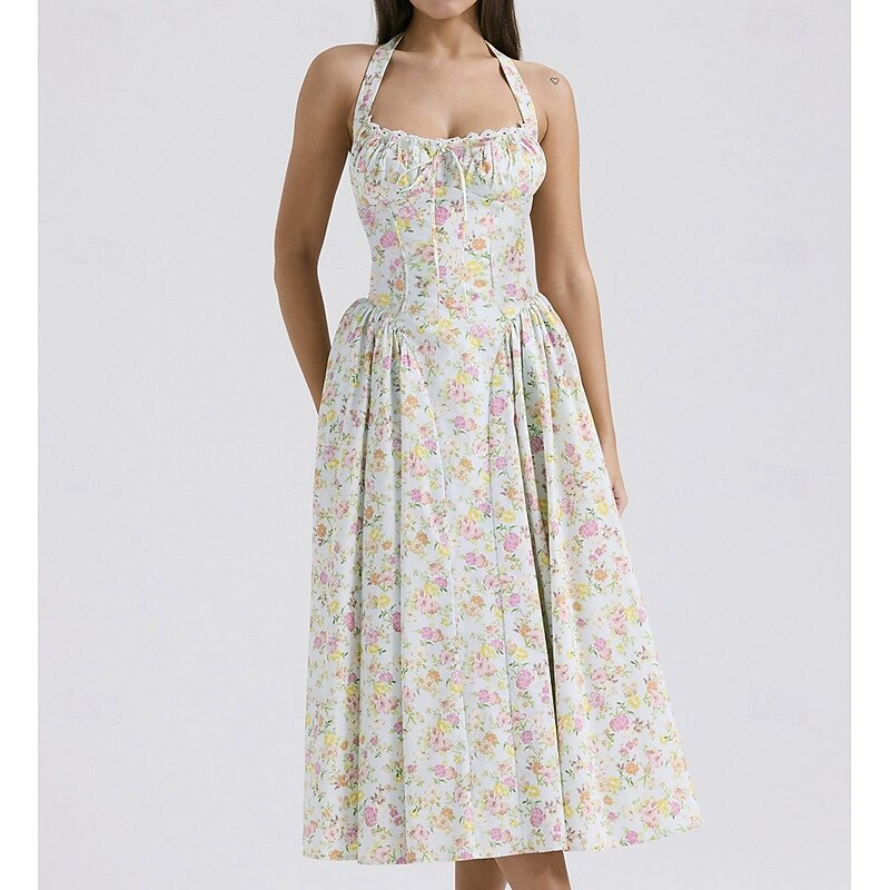 Retro Vintage Medieval Renaissance Midi Dress Flare Dress Halter Regency Inspired Floral Fancy Dress Women's Masquerade Wedding Vacation Casual Daily Adults' Dress Summer 23