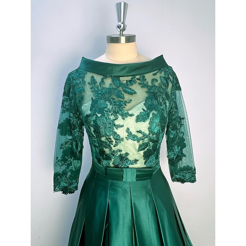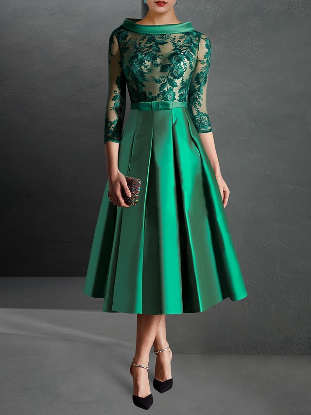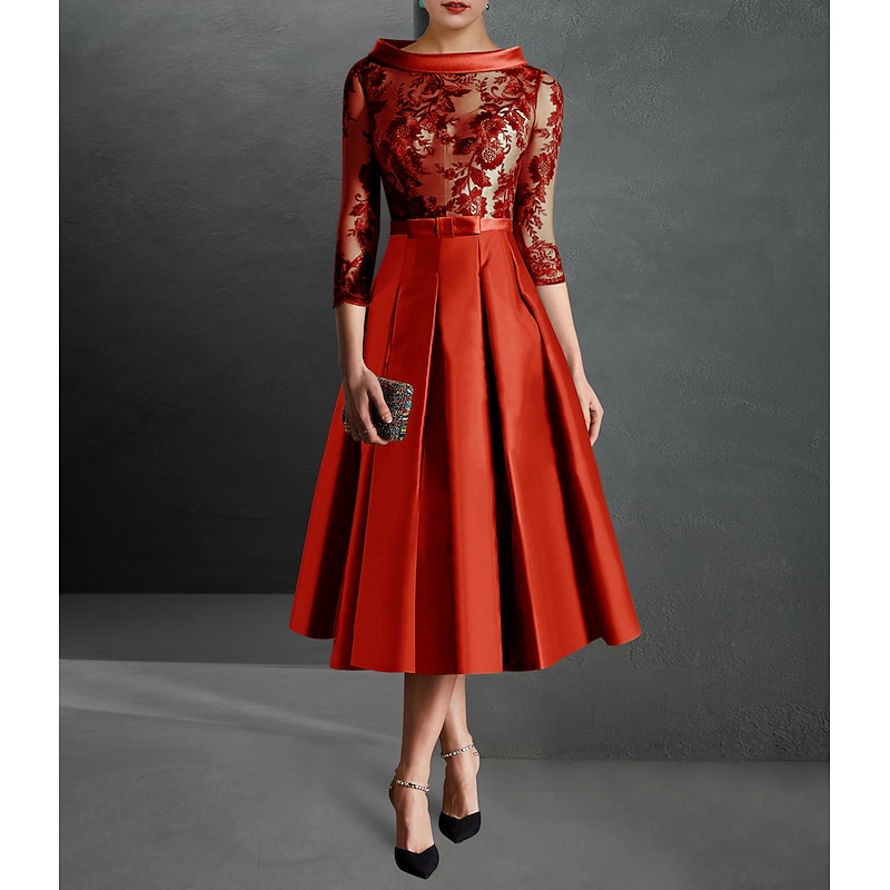 More information about A-Line Mother of the Bride Cocktail Dresses Elegant Dress Formal Kentucky Tea Length 3/4 Length Sleeve Jewel Neck Fall Wedding Guest Satin with Pleats Appliques Dresses