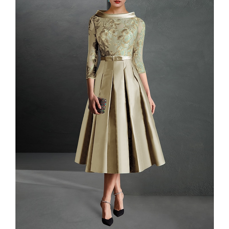 A-Line Mother of the Bride Cocktail Dresses Elegant Dress Formal Kentucky Tea Length 3/4 Length Sleeve Jewel Neck Fall Wedding Guest Satin with Pleats Appliques Dresses 1