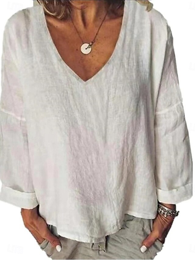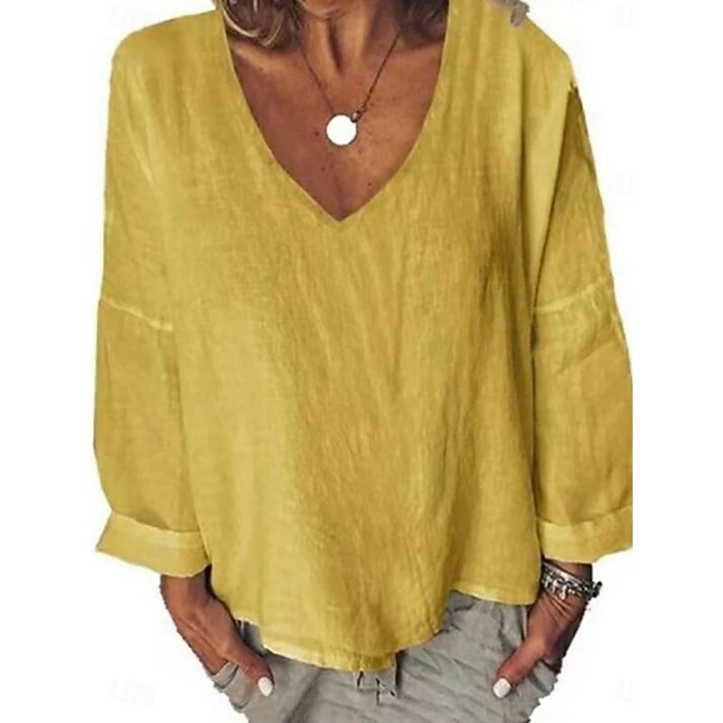 More information about Women's Shirt Blouse Cotton Linen Shirts Solid Color Basic Casual Long Sleeve V Neck Regular Tops Daily White Yellow Summer Spring