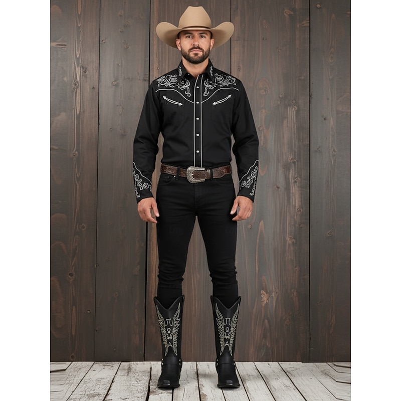 Highlights [Fabric] : Crafted from high-quality faux leather and PU, these men's cowboy boots ensure durability and comfort, making them perfect for wear throughout the fall and winter seasons. [Fit] : These boots offer a classic fit with their pointed toe design and sturdy block heels, providing not only style but also practicality for daily wear. [Design Highlights] : Featuring a sophisticated black and grey color scheme, the boots are adorned with intricate white embroidery patterns on the shaft that add a distinctive flair. The decorative straps with metal accents around the ankle enhance the rugged elegance, making them a versatile addition to any western-inspired outfit. [Occasions] : Ideal for daily and outdoor use, these vintage cowboy boots are perfect for making a bold fashion statement or complementing a western-inspired ensemble. Their stylish design ensures they will be a standout choice for any occasion. [Size Range] : Available in various sizes, including US 6 to US 12, these boots accommodate a wide range of foot sizes, ensuring a comfortable fit for all wearers.