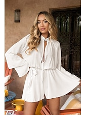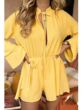 More information about Women's Romper Casual Solid Color Long Sleeve Crew Neck Ruffle Tie Belt Daily Going out Regular Fit White Yellow Brown Fall