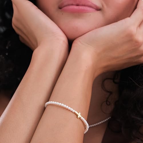 HOT ! 18K Gold Vermeil Cross Pearl Bracelet for Women, Dainty Beaded Religious Jewelry, Adjustable Faith Bracelet Gift for Her