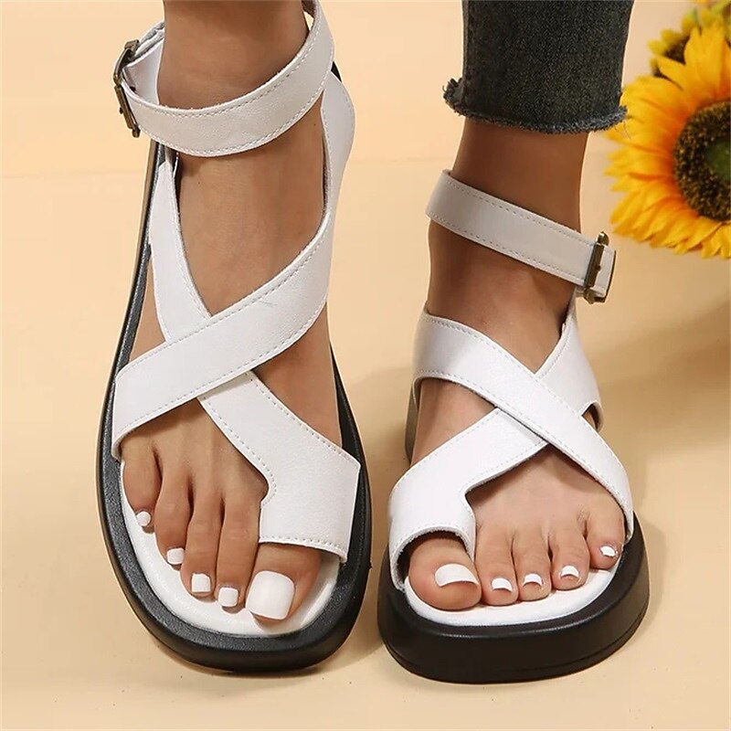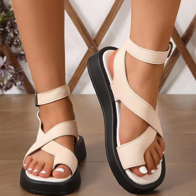 : Featuring a chic crisscross strap pattern, these sandals provide both style and stability. The ankle strap comes with a buckle closure for a secure fit, while the open toe design ensures a breezy feel, making them ideal for warm weather. A slightly elevated sole provides gentle arch support and added comfort.