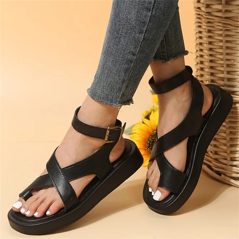 Women's Black Open Toe Sandals with Crisscross Straps and Ankle Buckle, Comfortable Flat Sole Summer Shoes for Walking, Travel, and Casual Wear