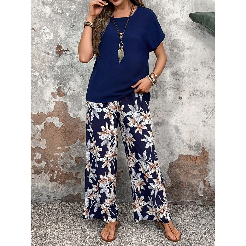 HOT ! Women's Fashion Streetwear Daily T Shirt Wide Leg Pants Short Sleeve Crew Neck Floral Drawstring Casual Daily Black Navy Blue Green Summer Regular Fit