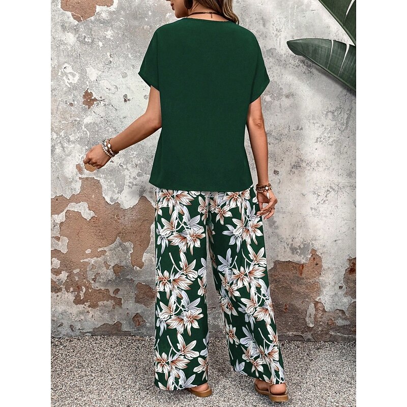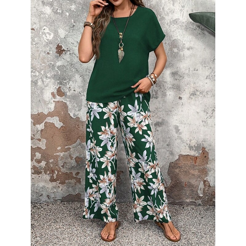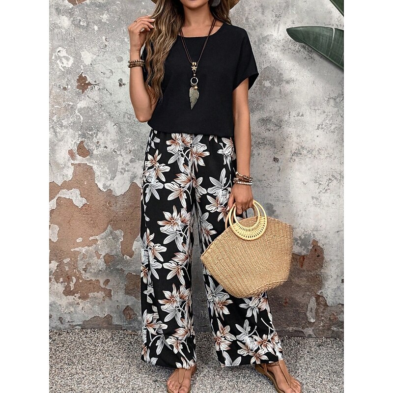 Women's Fashion Streetwear Daily T Shirt Wide Leg Pants Short Sleeve Crew Neck Floral Drawstring Casual Daily Black Navy Blue Green Summer Regular Fit 25