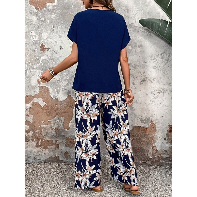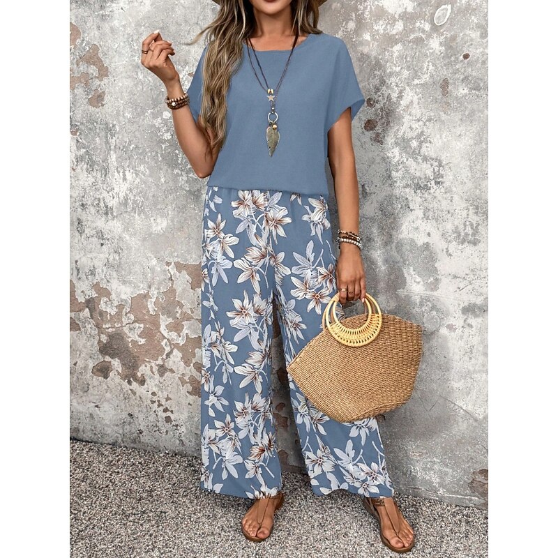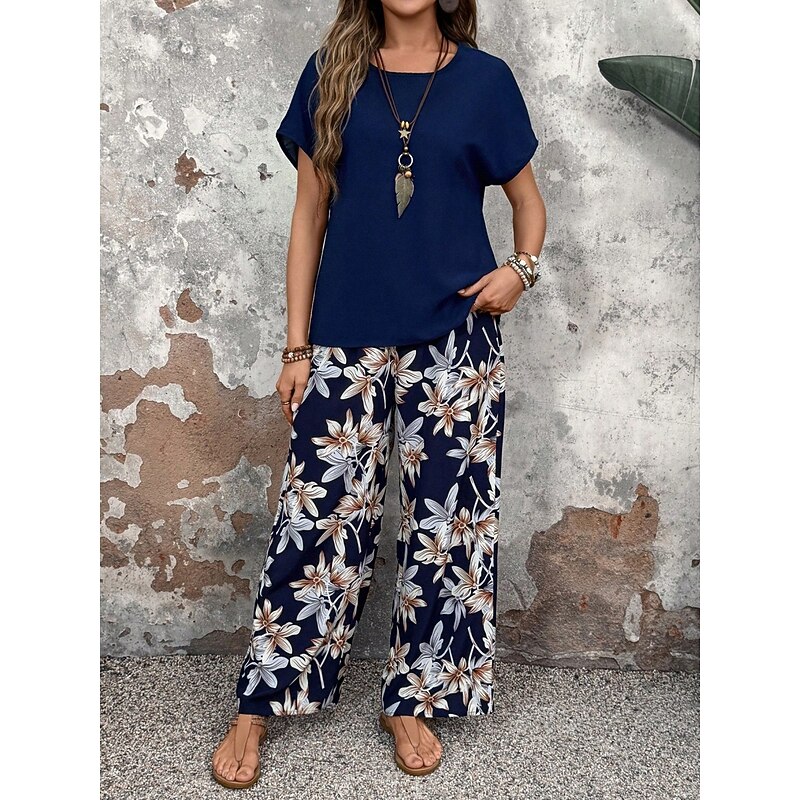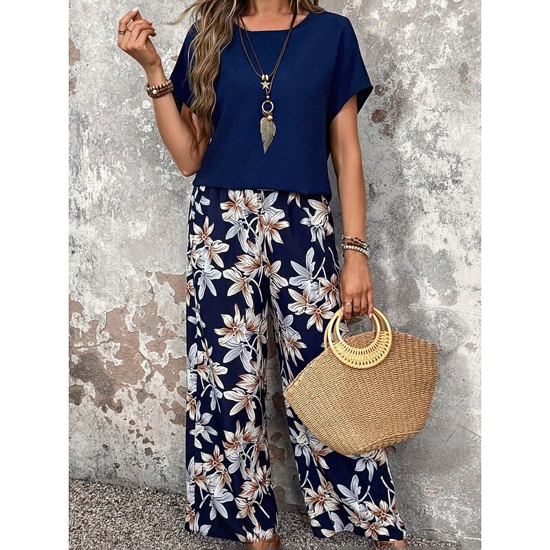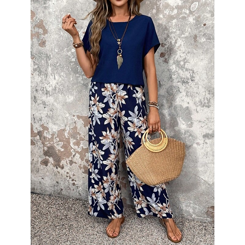More information about Women's Fashion Streetwear Daily T Shirt Wide Leg Pants Short Sleeve Crew Neck Floral Drawstring Casual Daily Black Navy Blue Green Summer Regular Fit
