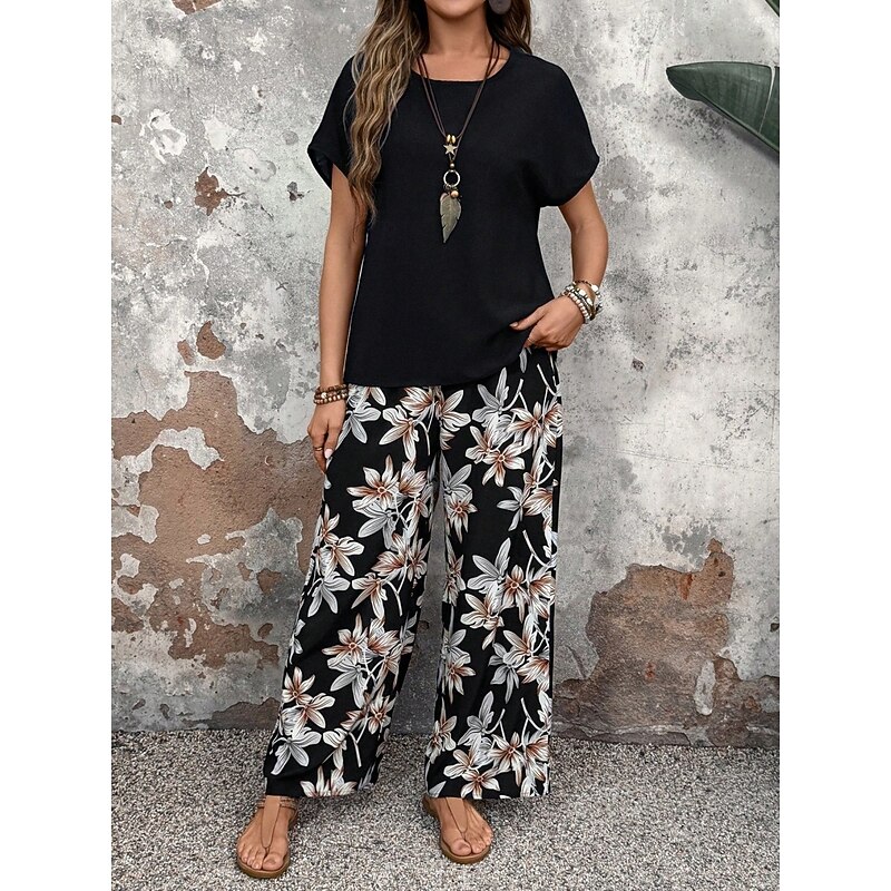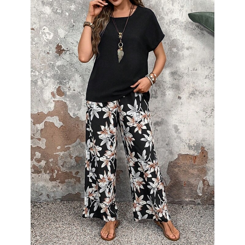 Women's Fashion Streetwear Daily T Shirt Wide Leg Pants Short Sleeve Crew Neck Floral Drawstring Casual Daily Black Navy Blue Green Summer Regular Fit 21