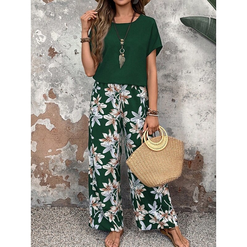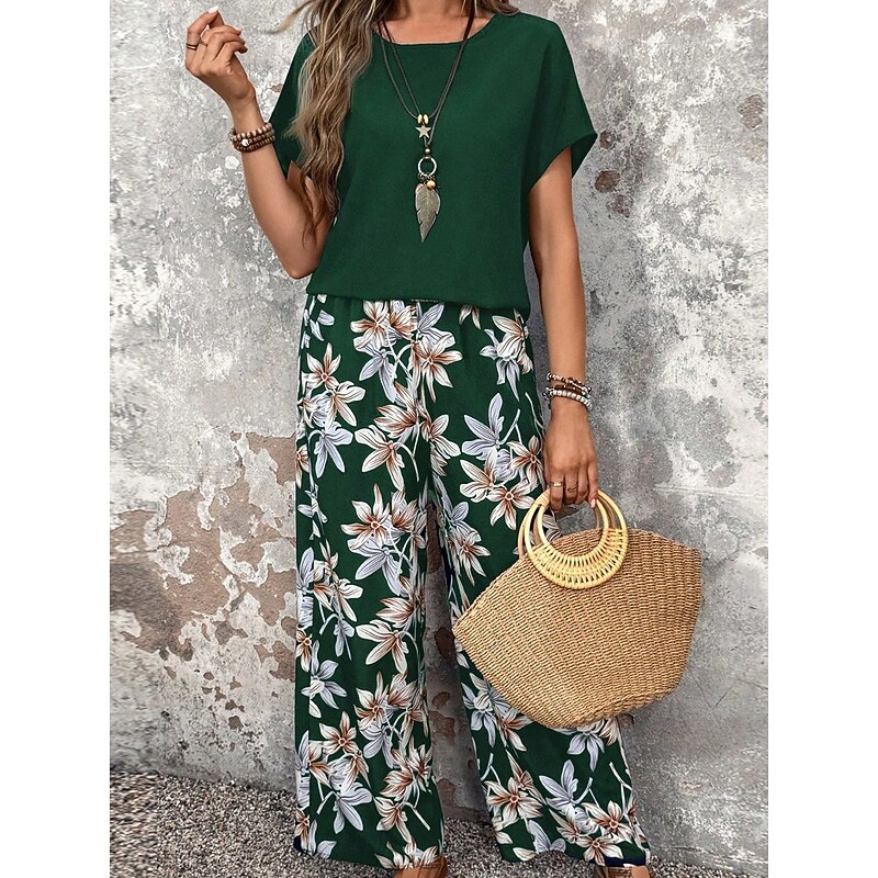Women's Fashion Streetwear Daily T Shirt Wide Leg Pants Short Sleeve Crew Neck Floral Drawstring Casual Daily Black Navy Blue Green Summer Regular Fit 1