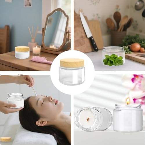 25 Pcs Glass Jars with Plastic Woodgrain Lids and Inner Liners 2 oz Clear Cosmetic Containers Empty Round Small Containers for Making Creams Lotions Powder Ointments Candle 4