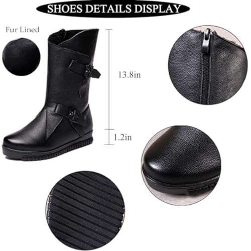 More information about Women's Genuine Leather Side Zipper Flat Mid-Calf Boot Comfort Soft Sole Wide Round Toe Fur Lined Warm Winter Boots Fashion Double Belt Buckle Decoration Non-Slip Lug Flat Boots