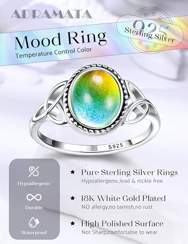 HOT ! ADRAMATA 925 Sterling Silver Mood Ring for Women Vintage Celtic Knot Rings Jewelry 18K White Gold Plated Oval Solitaire Mood Ring Temperature Control Color Change Mood Ring