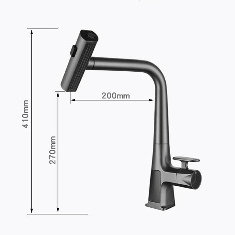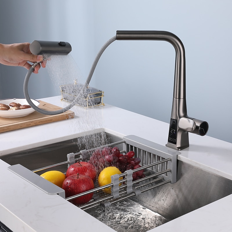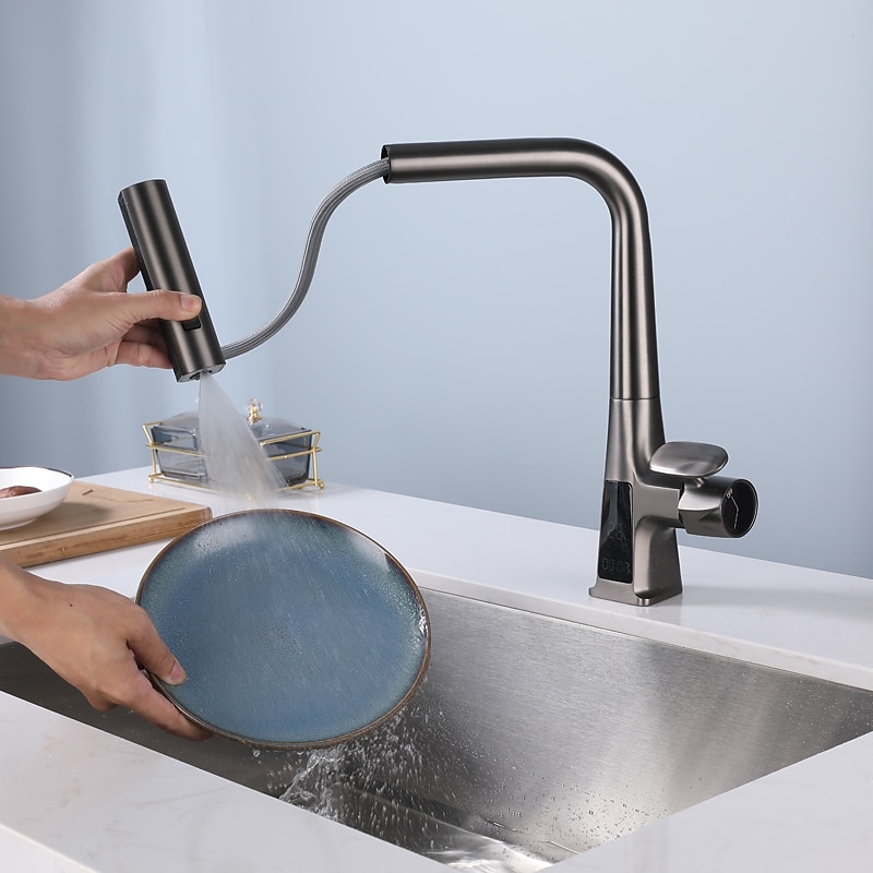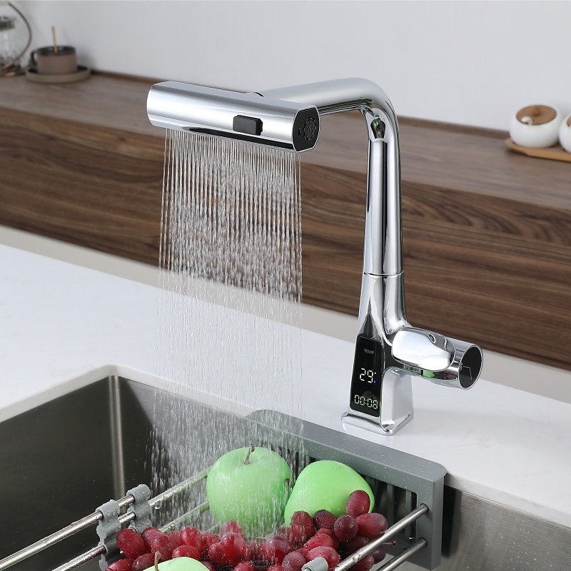 Highlights Sleek and modern design for the various kitchen decor LED temperature display to convey convenience and precision TWO water outlets THREE modes to meet various washing needs High-quality ceramic valve ensures a smooth and reliable operation Pull down / pull out sprayer to reach every corner of the kitchen sink Pause button on the sprayer to immediately control the flow Simple and clear instructions for your easy installation