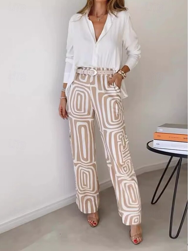 More information about Women's Fashion Streetwear Daily Shirt Linen-Inspired Sets Two Piece Sets Dress Pants Long Sleeve Bishop Sleeve Shirt Collar Plain Printing Patchwork Print Formal Casual Daily Khaki Fall Regular Fit