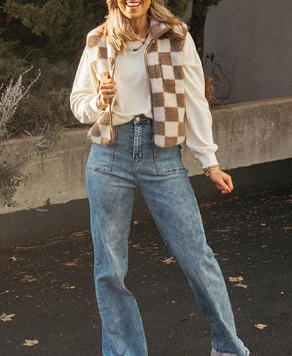 Sherpa Vest for Women Sleeveless Fuzzy Fleece Checkered Jacket Warm Casual Gilet Outerwear with Zipper 6