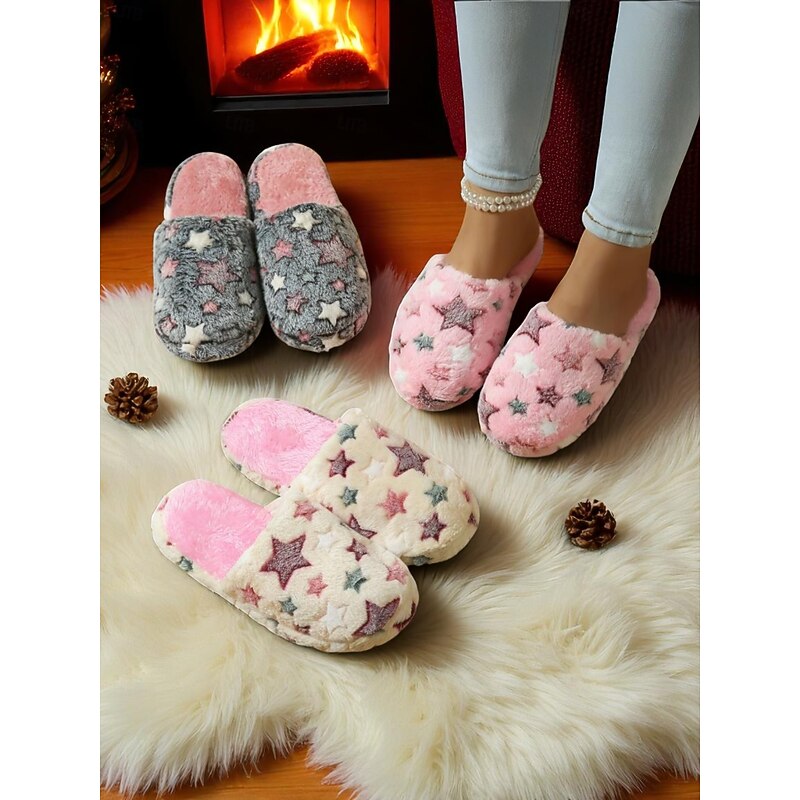 Women's Fuzzy Star Print Indoor Slippers – Cozy Faux Fur Winter House Shoes for Living Room, Bedroom & Holiday Mornings 19