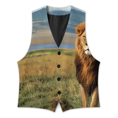 HOT ! African Lion at Lake in National Park Men's Suit Vest Waistcoat Vests Formal Dress with 2 Pockets for Business Casual Tuxedo