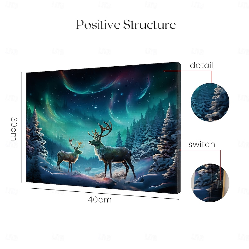 Highlights [Northern Light LED Canvas Wall Art] [Ignite Your Space with Aurora Magic:] Transform your decor with this breathtaking canvas wall art featuring the mesmerizing northern lights illuminating a winter wonderland. The scene captures two majestic reindeer standing gracefully amidst a snow-blanketed forest, creating a serene yet captivating visual experience. The vivid swirls of greens, blues, and purples of the aurora borealis bring an enchanting ambiance to any room. [Premium Canvas Material:] Crafted from high-quality canvas, this piece offers a refined and elegant gallery-like finish. The smooth texture enhances the intricate details and vibrant hues, making it a timeless addition to your art collection. The nonwoven fabric ensures durability, allowing the artwork to maintain its beauty over time. [Innovative LED Design:] Illuminated by battery-operated LED lights, this canvas art not only depicts a stunning scene but also brings it to life with a subtle glow. The cleverly integrated LED elements highlight the magic of the northern lights, adding depth and dimension for a truly immersive experience. [Versatile Decoration:] Perfect for elevating the ambiance in various settings—whether adding a touch of wonder to your living room, creating a calming bedroom atmosphere, or enhancing the aesthetic of your home office. Ideal for those who cherish wildlife artistry and the spectacular beauty of nature. [Size Range Notice:] Available in a size of 30 x 40 cm, this canvas is perfectly proportioned for versatile placement, fitting comfortably in both compact and expansive spaces to suit your decorating needs.