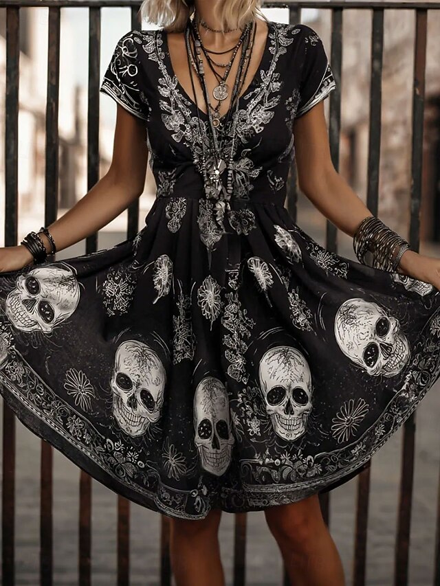 More information about Halloween Women's Skulls Print Mini Dress Casual Dress T Shirt Dress Tee Dress Sundress A Line Dress Vacation Casual Boho Beach Graphic Skull Short Sleeve V Neck White Pink Blue Purple Spring