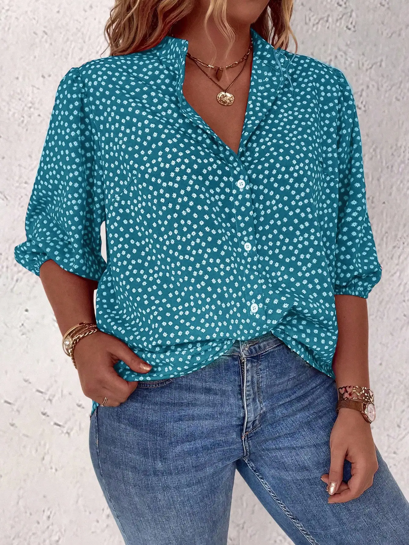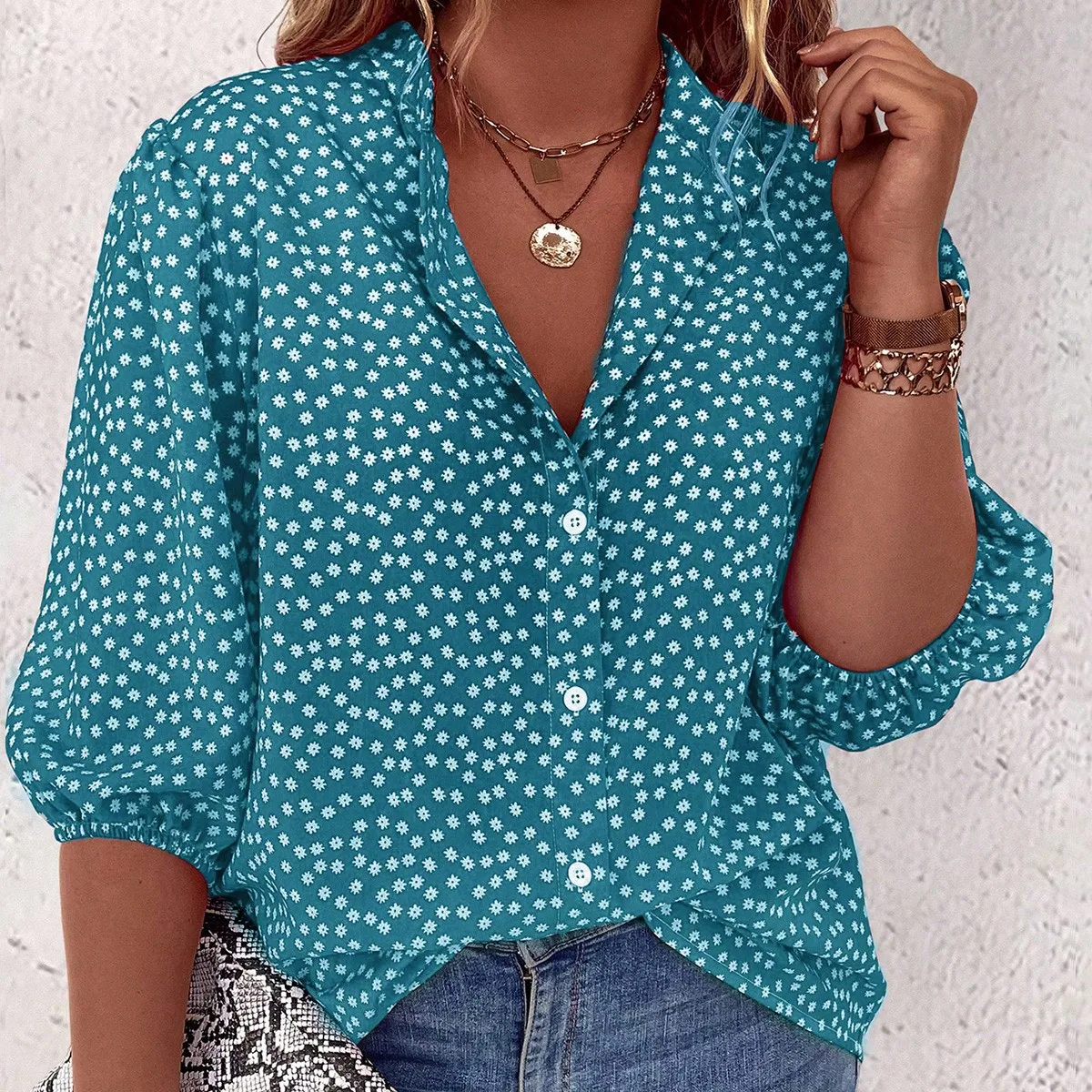 SpecificationsChoice: YesCollar: V-NeckElasticity: Slight StretchFit Type: LooseMaterial: Polyester BlendedSeason: Spring/SummerSleeve Length: Three QuarterStyle: European Recommend to size up from usual size