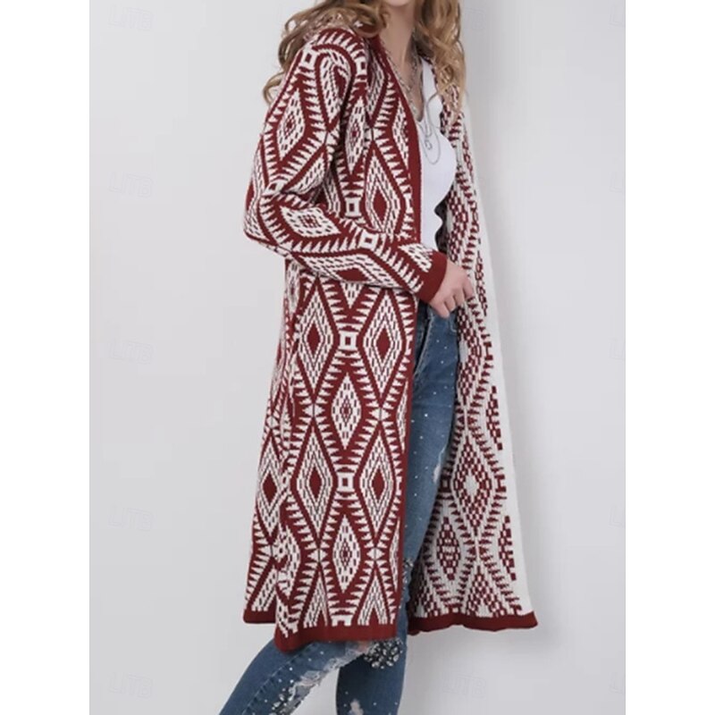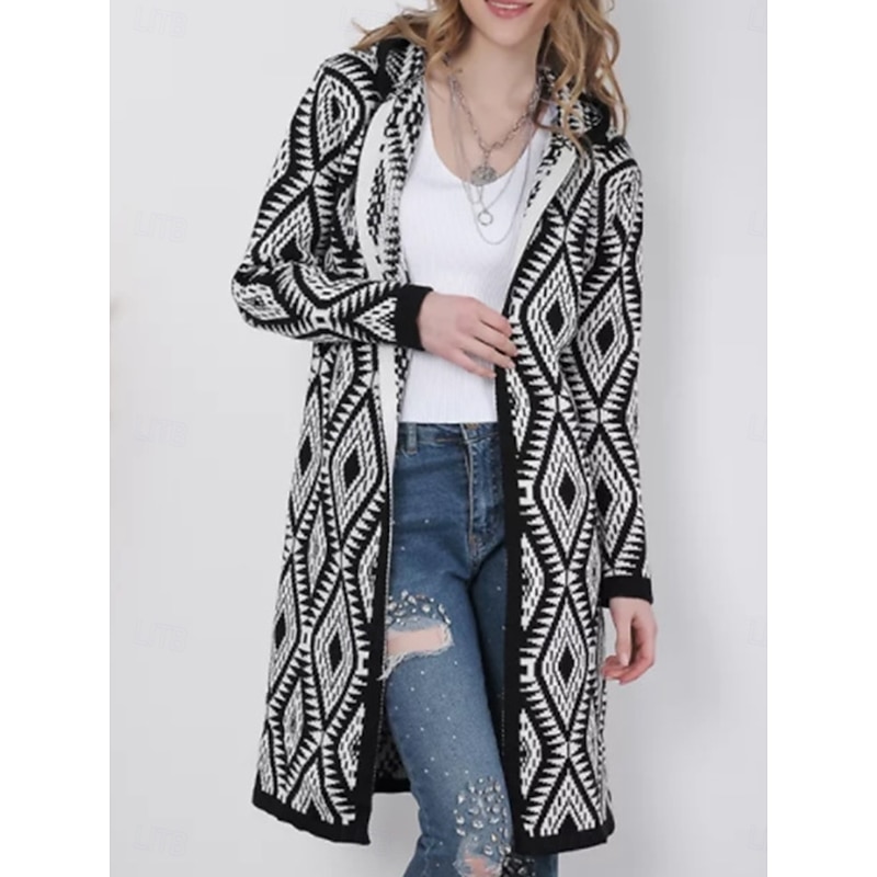 Women's Zip Sweater Sweater Jacket Casual Sweater Casual Soft Geometric Paisley Crew Neck Zipper Hooded Long Sleeve Regular Tops Knit Outdoor Daily Weekend Wine Red Black Fall Winter 12