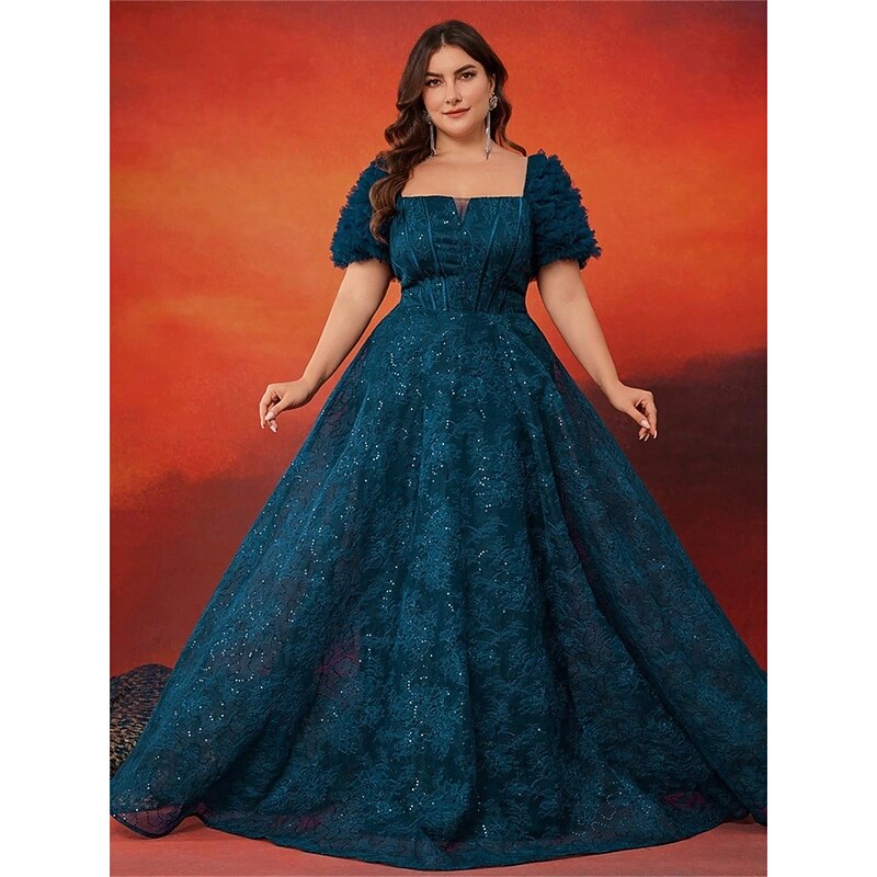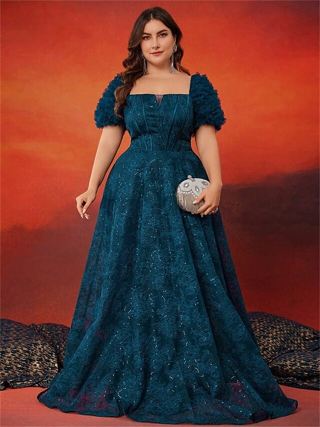 A-Line Plus Size Dresses Elegant Curve Dress Formal Wedding Floor Length Short Sleeve Square Neck Lace with Pleats 1