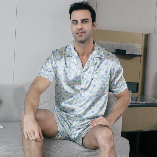 HOT ! Men's Satin Pajama Set Short Sleeve Silky Short Pants Button Down Sleepwear Multicolor Silky Men's Pajama Set