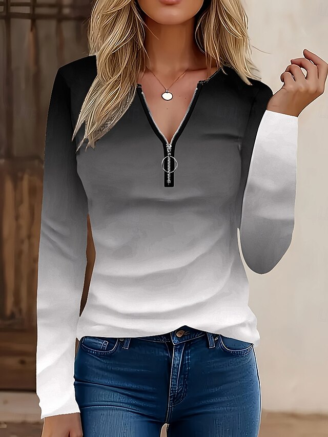More information about Women's T Shirt Graphic Gradient Elegant Vintage Stylish Long Sleeve V Neck Round Neck Notched Neck Regular Tops Daily Weekend Zipper Print Black Light Green Spring Fall Winter