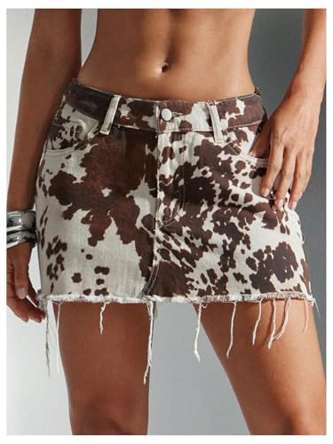 HOT ! Floerns Women's Y2k Mini Denim Skirt Cow Print Low Waist Raw Hem Western Jean Skirt