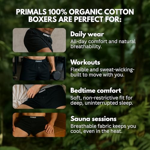 • TESTOSTERONE BOOSTING: The fact is toxic, modern polyester blend underwears have been scientfically proven to harm men's physical, reproductive and hormone health - and the only true solution is PRIMALS 100% organic cotton boxers. Once you make the switch, prepare to experience increased testosterone, improved fertility and boosted masculinity.