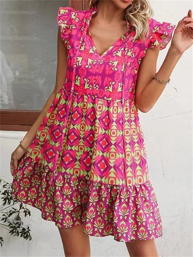Women's Boho Graphic V Neck Mini Dress Sleeveless Summer Spring 1