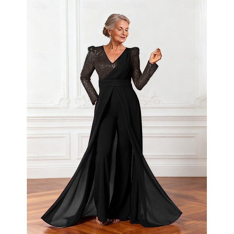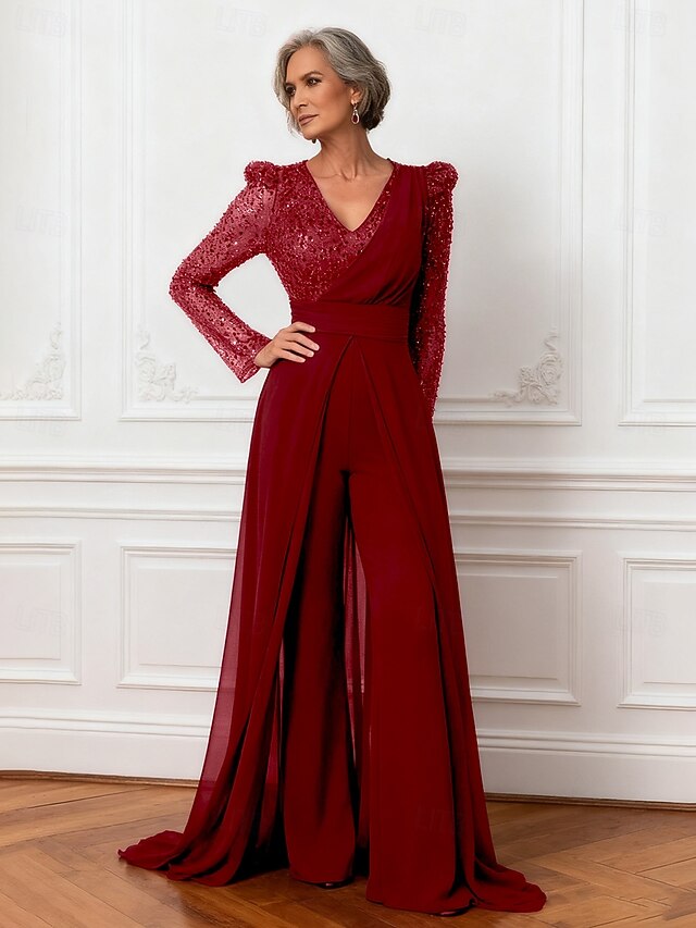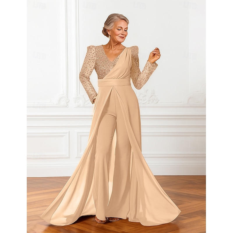 More information about Jumpsuits Mother of the Bride Dress Elegant Sparkle & Shine V Neck Floor Length Chiffon Long Sleeve with Sash / Ribbon Sequin