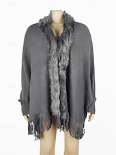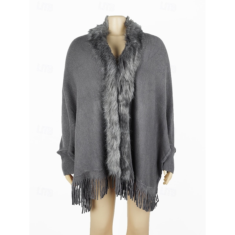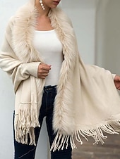 Highlights [Fabric] : Crafted from a high-quality woolen blend, this cardigan offers a luxurious and soft feel, ensuring both comfort and durability for cooler seasons. The material's micro-elastic properties provide a snug fit that drapes beautifully over any ensemble. [Fit] : Designed in a regular fit with a long, open-front silhouette, this cardigan allows easy layering over various outfits, from casual to more formal attire. Its long sleeves add an element of elegance, while the length enhances its stylish appeal. [Design Highlights] : The cardigan features a standout plush faux fur trim that adds a touch of sophistication and glamour. The fringed tassel ends provide a classic, bohemian elegance, while the solid khaki beige color versatility complements a wide range of wardrobe options. [Occasions] : Ideal for fall and winter seasons, this cardigan is perfect for both formal events and outdoor gatherings. Whether you're attending an elegant dinner or taking a leisurely stroll outdoors, this shawl adds warmth and style to any occasion. [Size Guidance] : Available in a convenient one-size fits most, accommodating various body types with ease. This versatile fit makes it a practical choice for women looking for a chic, stylish layer that requires minimal size consideration.