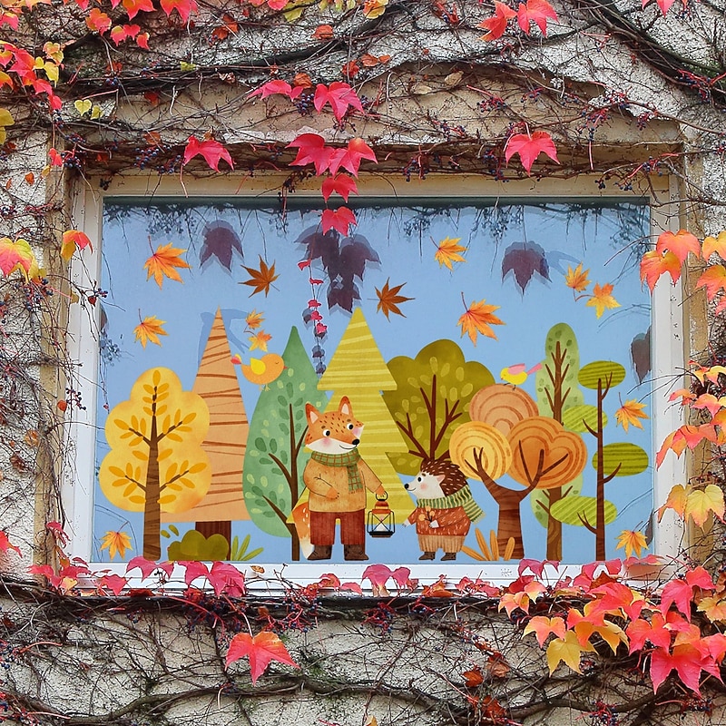 $9.99 - Fall Window Clings Autumn Thanksgiving Decoration, Double-Sided Visible Static Stickers with Cartoon Forest Leaves, Fox and Hedgehog, Removable Glass Decals for Window and Display 2025. Shop for cheap Thanksgiving & Fall Decoration online? Buy at lightinthebox.com on sale today!