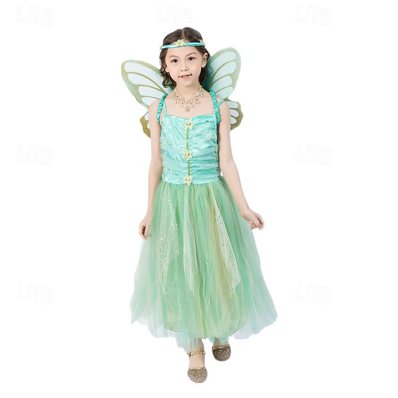 : The vibrant green fairy costume is adorned with delicate floral appliqués on the bodice, complemented by gathered detailing that exudes elegance. The whimsical design is enhanced by shimmering ruffles on the shoulder straps. The lush tulle layers of the skirt create a full, voluminous silhouette perfect for twirling. Ethereal green wings and a matching headband with floral accents complete the enchanting look.